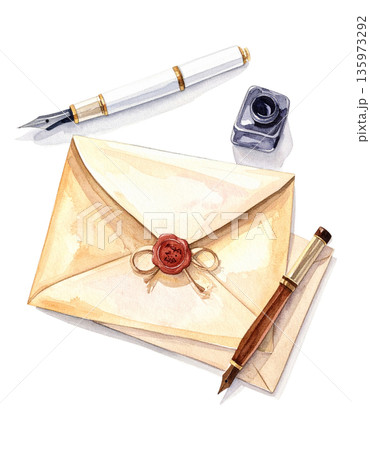 積み上げられた本と手紙とインク瓶 水彩 透過素材
