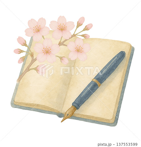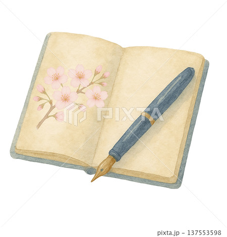桜の花とノートと万年筆の水彩イラスト 春の手帳メモ素材