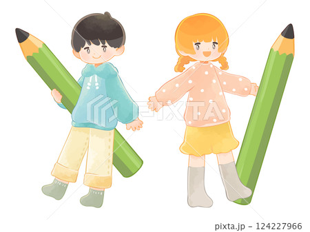 大きな鉛筆を持つ子ども達の学習イメージイラスト