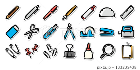 文房具の手描きイラストステッカーセット 学校、オフィスで使えるステーショナリーベクター素材