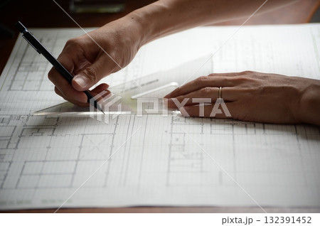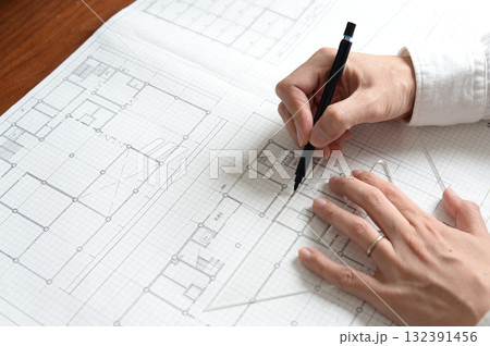 夜に自宅で建築の設計製図でコンパスを使う風景