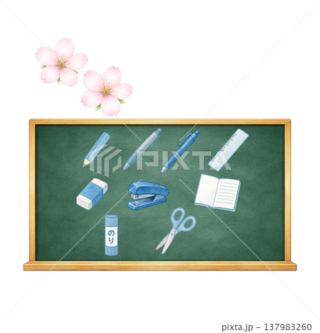 黒板と文房具と桜のセット素材 春の教育イメージ 学校教材 白背景