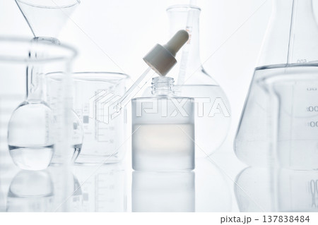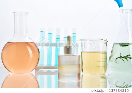 Scientific laboratory glassware with dropper bottle creating beauty serum