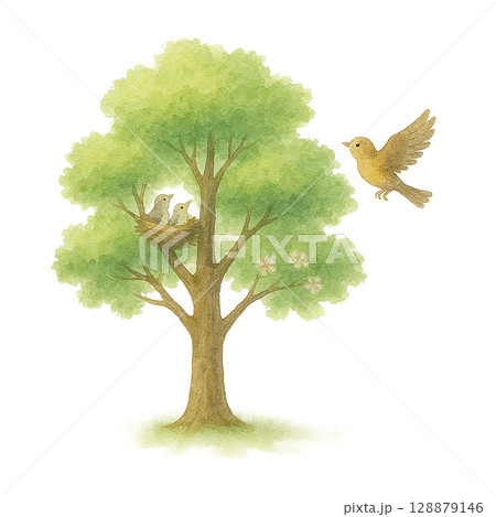 樹上の巣と小鳥の樹木イラスト(PNG切り抜き)