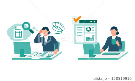 予算管理のビフォーアフターのイラスト アナログ管理からダッシュボードの自動計算と予測へ移行する男性