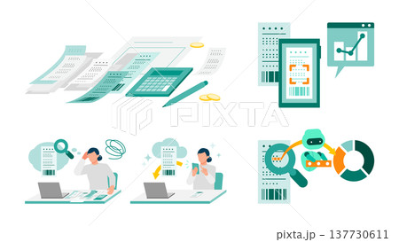 スマートフォンでレシート・請求書をスキャンするビジネスマンのAI・OCR自動化イラストセット