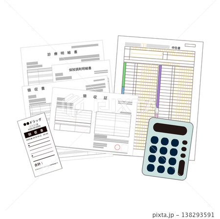 レシートと請求書と電卓のイラスト 確定申告や経理の計算業務を表現するアイコン