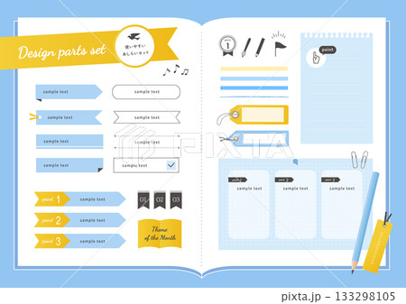 メモ・ノート・文房具のフレームのセット あしらい 飾り 装飾 枠 付箋 メモ帳 素材 シンプル 本