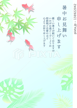夏のお見舞いハガキデザイン モミジと金魚とトロピカル植物