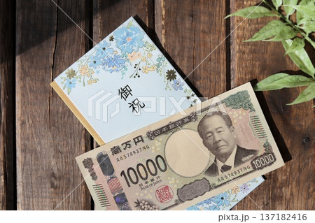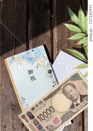 水色で花柄のご祝儀袋と新札の一万円 日本の風習