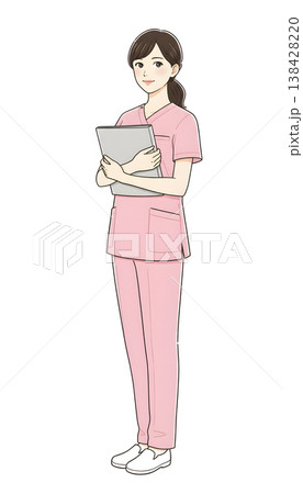 バインダーを胸に抱えて立つ看護師・全身イラスト(シンプル手描き風)