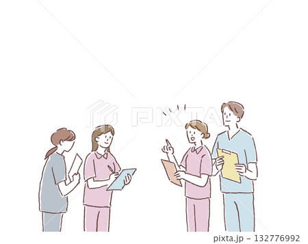 申し送り、ミーティングをする看護師、介護士、線画