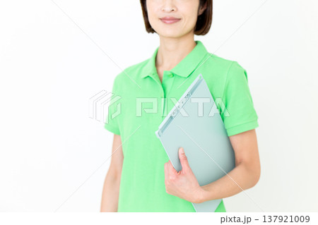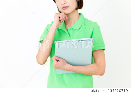 グリーンの作業服を着てバインダーとペンを持つミドル男性ビジネスマン