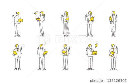 PCや書類ファイルを持ってひらめいているビジネスパーソンの全身イラストセット