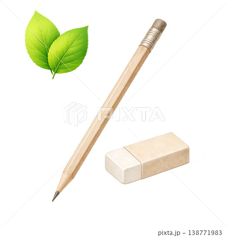 鉛筆と消しゴムと新緑の葉 水彩イラスト 学習や教育のナチュラル素材