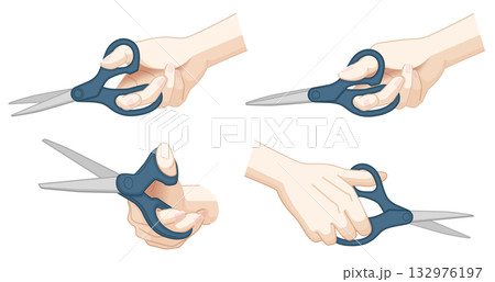 ハサミを持つ手のモノクロ線画と黄色人種、白人、黒人がハサミを持つ手のバリエーション