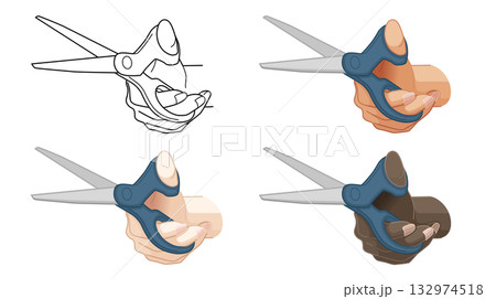 ハサミを持つ手のモノクロ線画と黄色人種、白人、黒人がハサミを持つ手のバリエーション