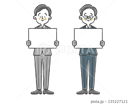 パネルを持って告知する、年配の社長とビジネスマンの上半身ベクターイラスト素材セット_カラー