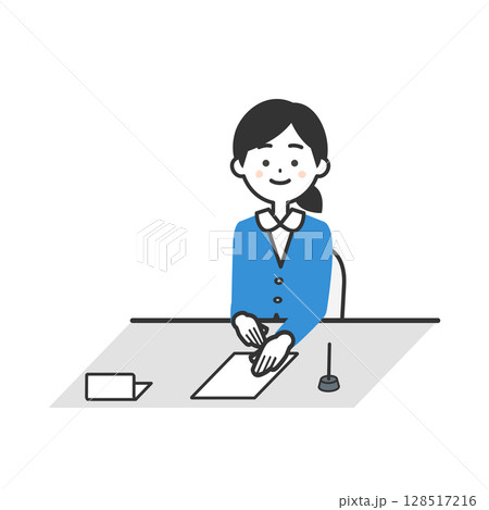 透明な仕切りが置かれた窓口に座るスーツ姿の女性イラスト