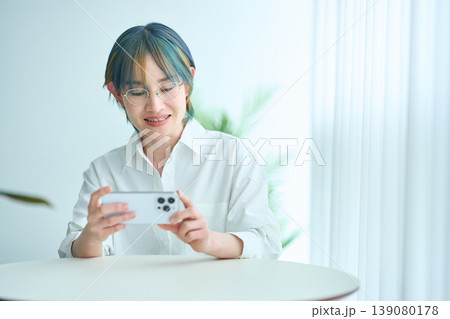 女性 スマートフォン スマホ 笑顔