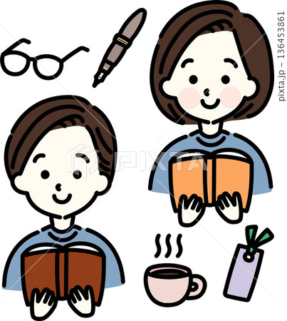 手描きテイストな秋の読書グッズのイラストセット(カラー・秋色01)