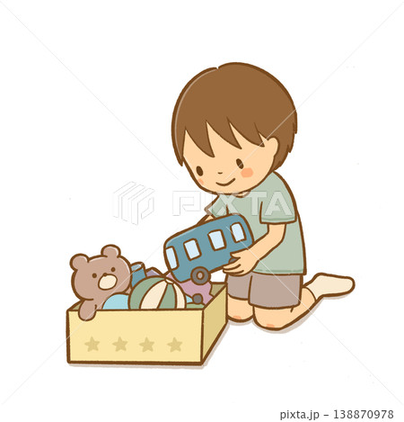 幼稚園・保育園パンフレット用素材 おもちゃを片付ける男の子 くすみカラーのおしゃれな園だより・しおり