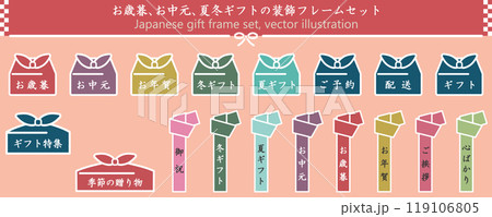 お歳暮、お中元、お年賀、冬ギフト、夏ギフトの和風フレームセット ベクターイラスト 風呂敷 贈り物お歳