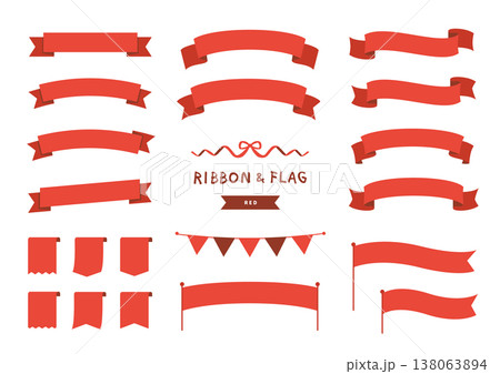 赤のリボンとフラッグの装飾セット 見出しバナー素材