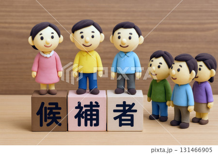 候補者として並ぶ男女の粘土人形と応援する有権者たちの選挙イメージ