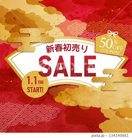 和風金雲と赤背景の新春初売りセールバナー