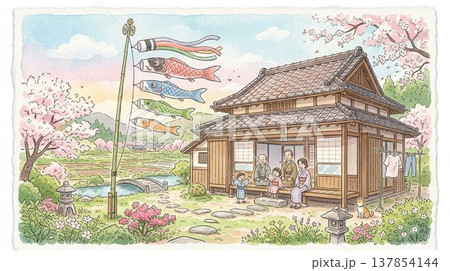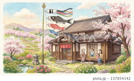 こいのぼりを見上げる子どもの初夏のやさしい風景イラスト