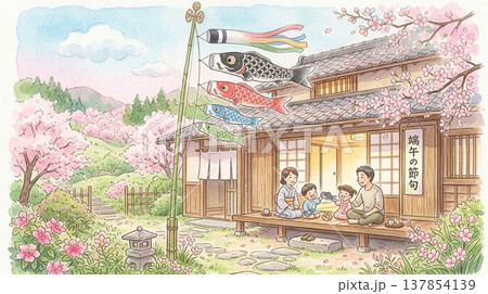 こいのぼりを見上げて喜ぶ家族の春のイラスト