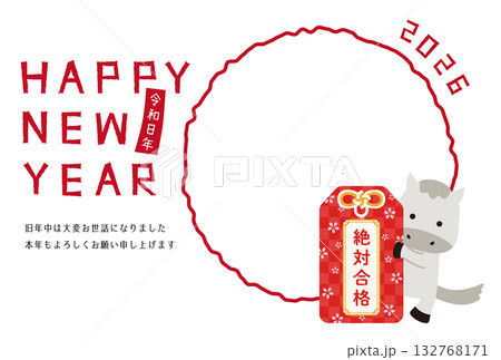 2026年 丸1つのフォトフレーム年賀状 白背景 お守りと白馬
