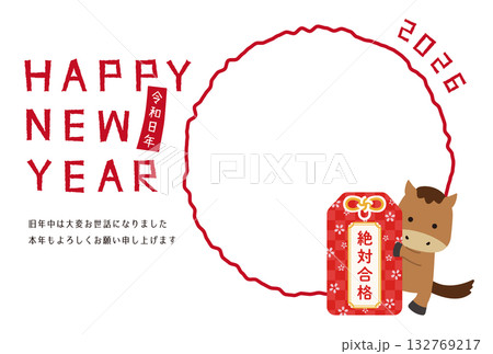 2026年 丸1つのフォトフレーム年賀状 白背景 お守りと馬
