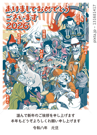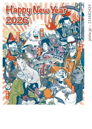 2026年賀状テンプレート「ちょっとおかしな七福神」ハッピーニューイヤー 添え書き付パターン