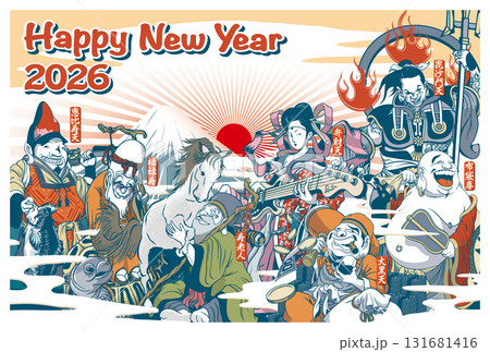 2026年賀状テンプレート「ちょっとおかしな七福神」ハッピーニューイヤー 英語添え書き付パターン