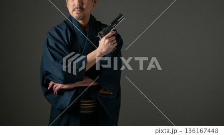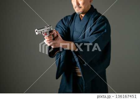 拳銃を持った映画俳優の中高年男性