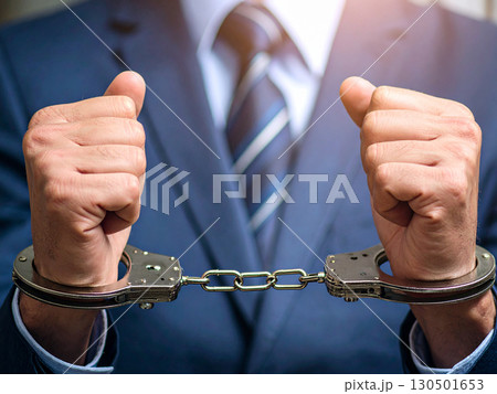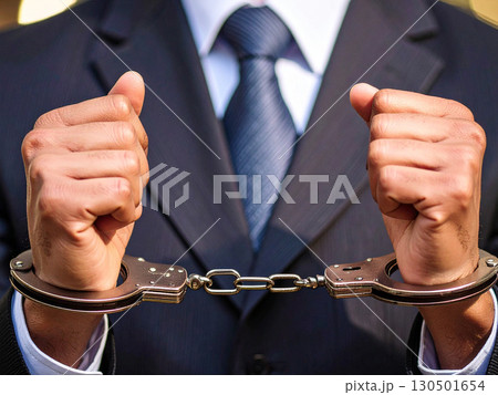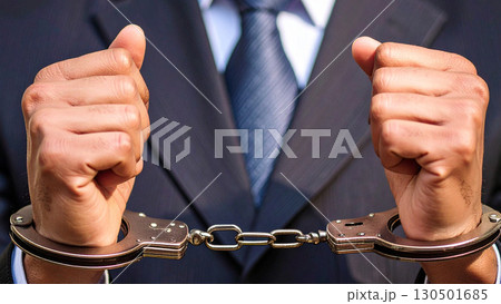 写真素材(高画質 有料) 犯罪で警察に捕まり手錠されて連行されている若い男性