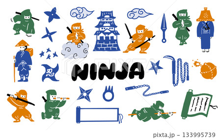 忍者と和風の人物・道具のイラストセット 忍びの動作・武装・古風アイテムの手描き風デザイン