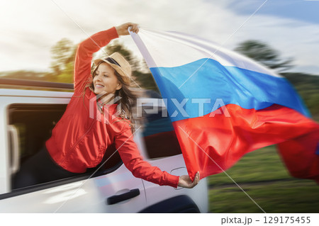 Woman celebrating Russia Day by waving the Russian flag from a car during a road trip, embodying pride and independence outdoors