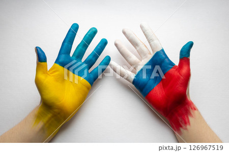 Painted human hands decorated with flags of Russia and Ukraine stand out on a white background. The concept of peace, friendship and creation