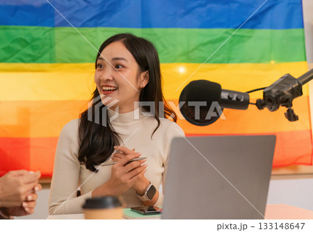 LGBTQ Pride. Woman smiling in a podcast studio with a rainbow flag backdrop.