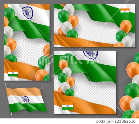 Happy Indian independence day posters set. Patriotic collection with realistic indian flag, air balloons and ashoka wheel. India country national celebration. 15th of August vector greeting cards.