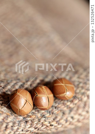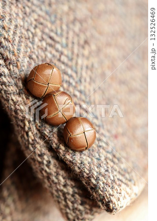 ツイードジャケットの袖口についているレザーボタン