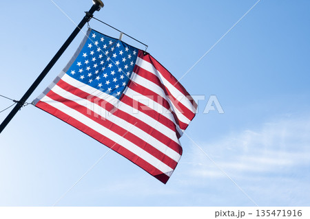 風になびくアメリカ国旗(星条旗)青空背景