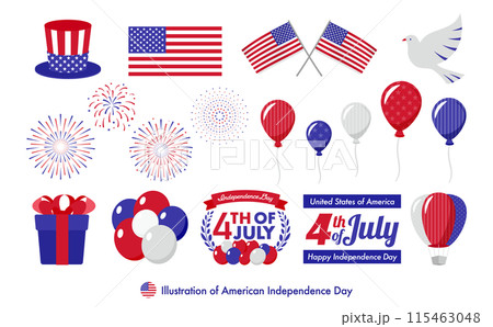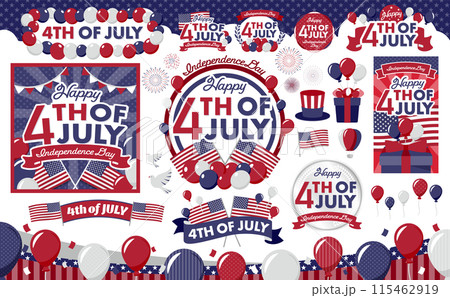アメリカ独立記念日のお祝い:アメリカ国旗アイコンと風船、4th of Julyの特別ロゴのセット