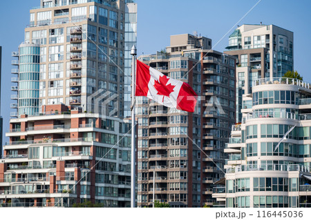 Canada Flag and Vancouver City skyscrapers skyline in the background with sunlight. Concept of canadian urban city life.