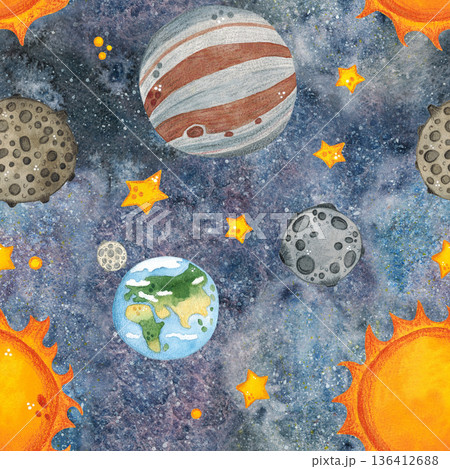 Seamless pattern, outer space in which the sun, earth, moon, other planets and stars fly. Hand drawn watercolor illustration. Space, outer space, universe, moon, star