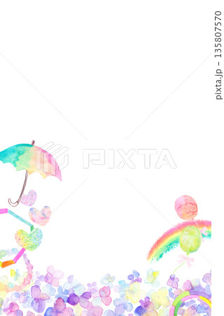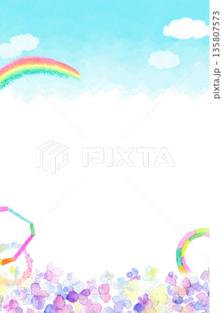 あじさい、街並み、虹色、背景、梅雨、縦、イラスト、かわいい