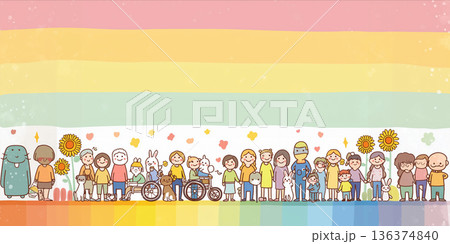 虹の下で多様な人と動物がつながる、共生社会を描いたやさしいイラスト